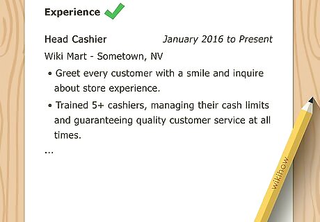 List your work history in a “Cashier Experience” section. Start with your most recent position and continue with any other positions in reverse-chronological order. Write your position title, main responsibilities, job location, and start and end dates. Write any relevant cashier experience, including restaurants and retail stores.
