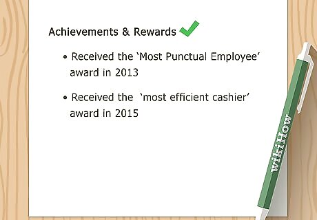 Explain your awards in a section titled “Achievements & Rewards." Detail awards received in both school and work. Write the name of the award and the date you received it. List awards in reverse-chronological order, starting with the most recent recognition. Include things like “Employee of the Month” and “Honor Roll for 2018 School Year.” If you don’t have any awards worth mentioning, you can skip over this step.