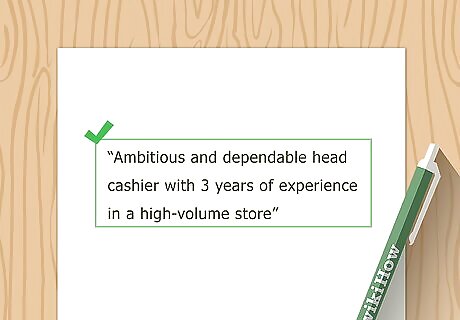 Summarize your skills in a 3-sentence "Career Objective." Include your talents, experience, and ambitions. You want to capture the hiring manager’s attention and stand out from other applicants. Write things like, “Ambitious and dependable head cashier with 3 years of experience in a high-volume store,” or “Recent graduate passionate and excited about to help others as a Cashier.” If you don’t have much experience, that’s okay! Highlight your desire to learn and your communication skills. Keep this section brief—you don't want it bogged down by keywords or a lengthy overview. A good summary will highlight your skills and show that you're a good fit for the job in question.