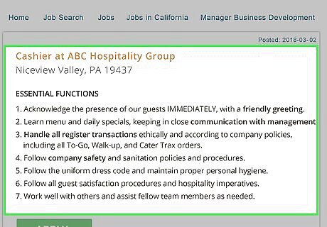Read the job description and add key words to your resume. Review the job to get a sense of the responsibilities and expectations. Look for key duties, and include similar words used in the description in the body as you complete your resume. For example, if you see “proven money-handling ability” written in the descriptions, be sure to include any money-handling experience, like during your church’s annual fundraiser, babysitting, or part-time job. Write this in your "Skills" section. Perhaps the description mentions needing someone with great time management skills. Mention your ability to multitask and meet deadlines in your "Skills" section. Make sure you meet the minimum qualifications, like having a high school diploma