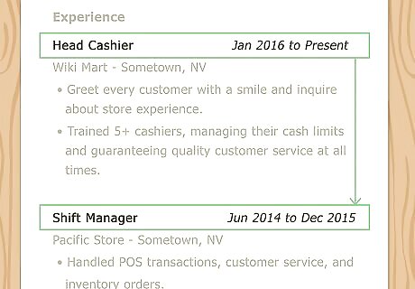 Start with your most recent position if writing a professional resume. If you are applying for a managerial role, list your cashier experience in reverse-chronological order. Mention how many employees you have trained and managed at a time. You can do this if you have 5 or more years of total experience, cashier or managerial. Starting with your most recent job shows employers what skills you are currently using. Listing your other work history will give employers a sense of your overall experience.