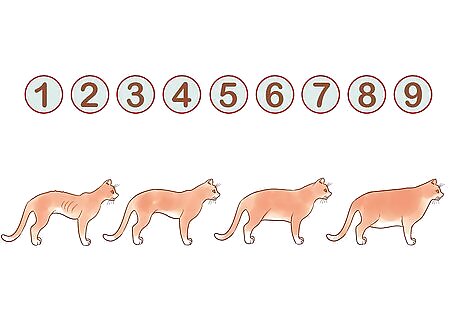 Do a body condition score. Before you put your cat on a diet, it’s important to determine whether or not your cat really needs to lose weight. A body condition score consists of a scale from one to five—with five being obese and one being emaciated. An ideal score is three. Rate your cat on the scale according to the following standards: Score 1: Ribs, spine, and pelvis stick out and can be seen even at a distance. The cat has no body fat and looks starved and bony. Score 2: Ribs, spine, and pelvis can be easily felt. Viewed from above, the cat has a distinct waist. Viewed from the side, the belly is tucked up. The cat looks thin. Score 3: Ribs and spine can be felt but not seen. The cat has a slight waist when viewed from above, and a level (but not saggy) tummy from the side. Ideal. Score 4: Ribs and spine difficult to locate. Pear-shaped tummy from above and sagging down from the side. Can be described as chunky or stout. Score 5: Bony landmarks obscured by fat. Thick cover of fat over chest and tummy. Oval silhouette. Obese.