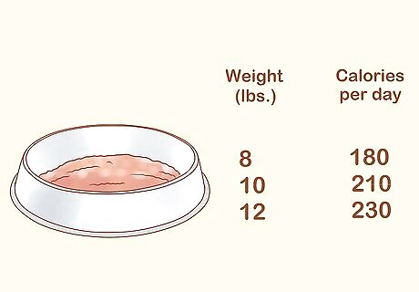 Determine the ideal caloric intake for your cat. This option means counting your cat’s calories as you switch her to the reduced diet. Veterinarians recommend that you feed your cat 75 to 80 percent of the resting energy requirements for her ideal weight. This amount should help your cat lose weight at a healthy pace of one to two percent of her body weight each week. You should consult your vet for the exact caloric amount, but approximate amounts are: 180 calories/day for an ideal weight of eight pounds 210 calories/day for an ideal weight of ten pounds 230 calories/day for an ideal weight of twelve pounds