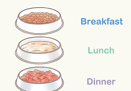 Provide a higher frequency of smaller meals. Do not place all of your cat’s food for the day—whether a diet formula or otherwise—out at one time for your cat to eat freely throughout the day. Cat’s do better with controlled portions provided at intervals, so you should divide your cat’s meals into two or three servings a day.