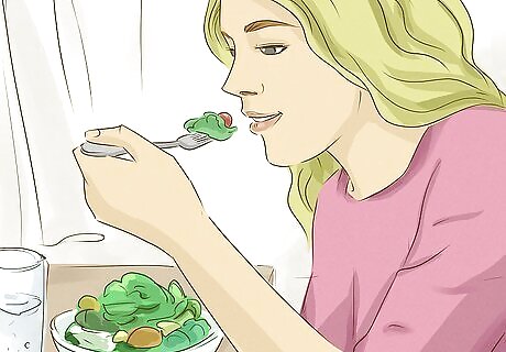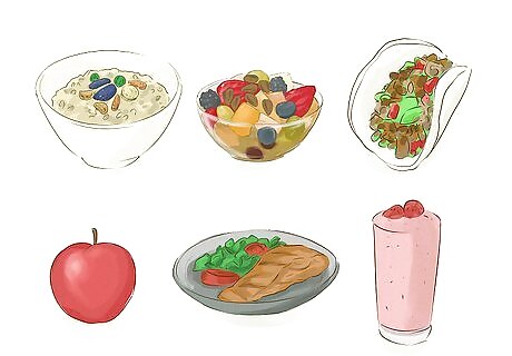 Eat 4-6 small, healthy meals spread throughout your day. Eating small meals throughout the day can help manage your blood sugar and your mood. Additionally, it helps you avoid disordered eating patterns that can lead to either restriction of calories or binging. Schedule 4-6 meals small meals every 2-3 hours to keep your blood sugar levels stable. Additionally, build your meals around fresh produce and lean protein. Generally, aim to eat about half of what you’d normally eat at mealtimes but eat more often.