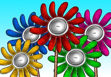 Consider attaching the flowers to garden canes. To give the flower a stem, you can attach it to a garden cane. Punch two holes in the center of the flower and run a bit of wire through the holes. Loop the wire around the garden cane and secure it to the back of the cane.