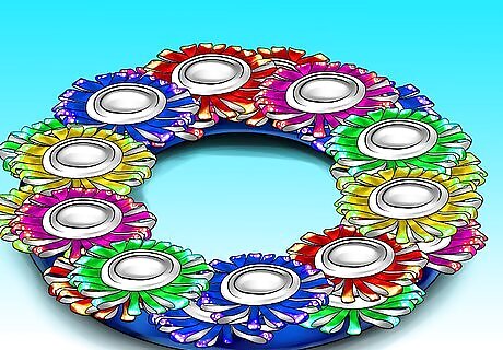 Glue the ‘flowers’ to a wreath. Your wreath can be a circle made of wire, or an actual wreath purchased at an arts and crafts store. Use a hot glue gun to glue the metal flowers to the wreath. If you don’t have a wreath, consider getting a pool noodle at the dollar store. Bend it so that is forms a circle and then connect the two ends with duct tape. Wrap a ribbon around that section of the pool noodle to hide the duct tape.
