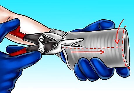 Cut the cans. Use aviation snips to make vertical slits down the side of the can. Start at the open rim and cut the can down to the base. Repeat this process all the way around the can. Make sure to leave 1.5 inches (3.8 cm) between each cut.