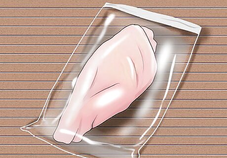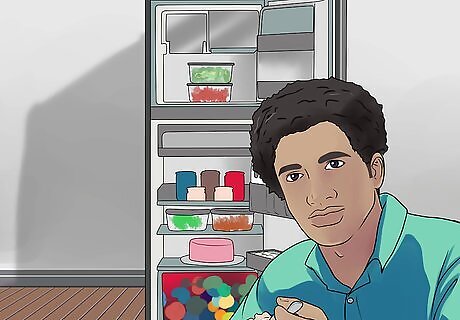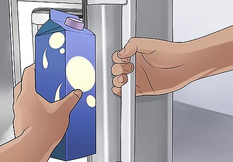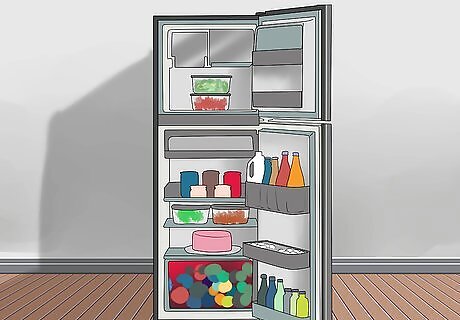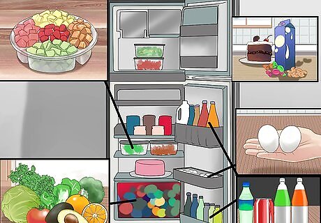Store food in the right parts of your refrigerator. Most people know which foods need to be refrigerated (milk, eggs, yogurt, meat, and some produce). But, not many people realize that certain foods should be stored in certain parts of the refrigerator. For example, the door of your refrigerator is one of the warmer parts of the fridge, so only store your condiments there. To properly store food in your refrigerator: Place milk and dairy products on the top shelf of your refrigerator since this is one of the coldest places. Use the crisper bins correctly. Separate your fruits from the vegetables and place them in their own crisper bins so you can control humidity levels. Vegetables should have higher humidity than fruits. Keep eggs in their carton so they get proper air circulation. Store meat on a tray on the lowest shelf of the refrigerator where the fridge is very cold. The tray will catch any drippings and prevent contamination.