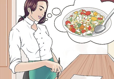 Get creative with meals. You might find that you get stuck in a meal planning rut. When this happens, try to think of types of meals that use up a variety of ingredients. Don't forget to consider trying meals or recipes that you've never made before. You might want to write down these categories of meals and fill them in with the specifics of what you have on hand: Stir fries Salads Pastas Soups Slow-cooker meals Pizza Rice-based meals