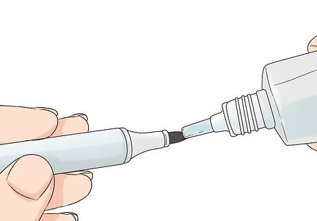 Drip the ink onto the marker nib slowly. The Various Ink has a small tip that allows you to add ink 1 drop at a time. Hold the marker below the container of ink at a 45-degree angle. Slowly drip the ink onto the tip of the marker, which is called the nib, by gently squeezing the bottle. The nib will absorb the ink.