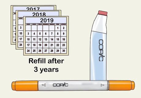 Refill the markers after 3 years. If you’ve had your Copic markers for 3 years or longer and haven’t refilled them, it’s time to do so. Copic markers have a 3-year shelf life, meaning the ink may evaporate after 3 years, leading to inconsistent coloring.