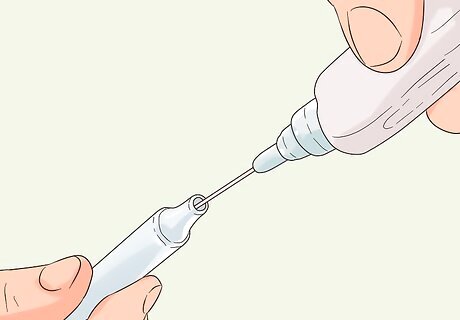 Insert the needle into the open end of the marker. Insert the needle of the refill booster into the opening that was created when you removed the nib. You don’t have to stick it all the way in the marker—just make sure the end of the needle is inside the opening of the marker. Hold the booster with the ink attached vertically over the top of the marker.
