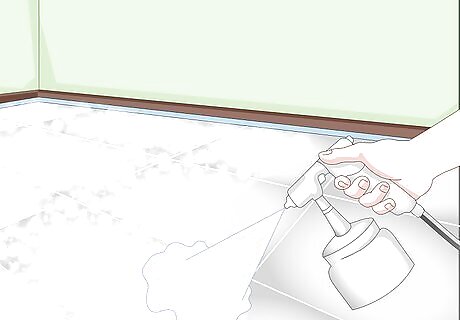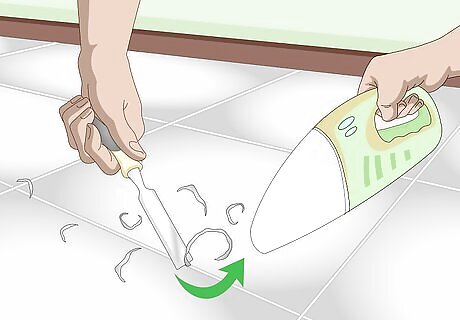 Remove the grout, if desired. If your grout is cracking, falling apart, or extremely moldy, then go ahead and chisel it out before moving forward. Use a flat head screwdriver, small hammer, and utility knife to apply pressure to the caulk beads. They may peel right up or you may need to gradually chip them away with the knife. Always keep your hands away from the knife’s path and go slowly. This step can get pretty messy, so keep a vacuum close by to suck up the dust and debris. Use a mix of muriatic acid and water to loosen the grout. Only use the acid if you are working in a well-ventilated area and wear a mask and gloves while handling it. You’ll want to replace the grout either before painting or after the epoxy paint has cured. It is really your choice. Grout covered with epoxy paint will be uniform and easier to clean. But, some people like the look of grout lines.