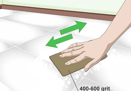 Wipe them down with sandpaper. Go over each tile with 400/600 grit sandpaper. Choose the wet/dry type of paper, so that you can move on to sanding directly after cleaning. Move your hand in small circles or back and forth motions and try to cover all tiles evenly. Rinse off the tiles with water when you are finished. Remember that your goal is to remove any surface bumps and imperfections, not to sand it down to its base. Porcelain tiles need to be prepared with an etching liquid or a pumice block so the glaze will adhere to it. Sanding increases the lifespan of your refinishing job by allowing the epoxy paint to more fully adhered to the surface of your tiles. Don’t get too discouraged if you can’t see clear results from your sanding. Just keep going and rub your hands over the tile’s surface to feel the change in texture.