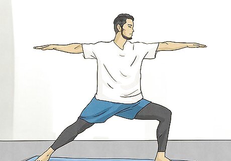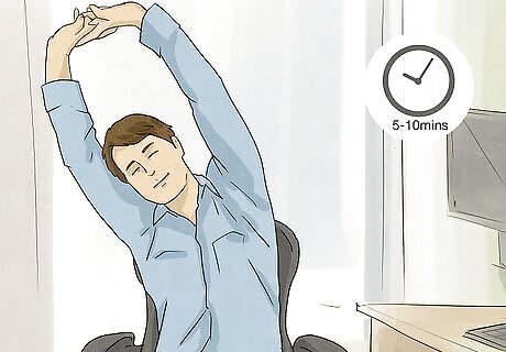 Stretch your body while relaxing. Shavasana, or corpse pose, is a particularly relaxing pose. Lie on your back with your legs spread and your arms at your side. Close your eyes and focus on your breathing as you lie there. Try to do some yoga every morning to lower your stress levels. If you’ve never done yoga before, look up a beginner’s video online to follow along with.
