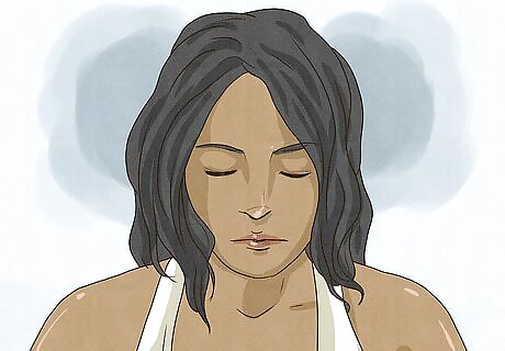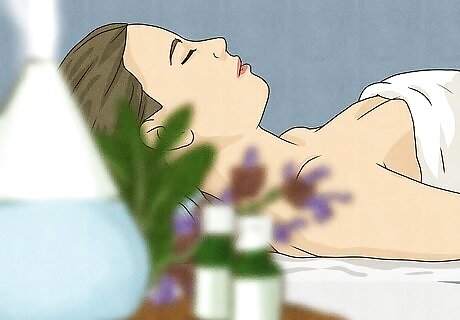 Use essential oils to calm your nerves. When you’re feeling stressed, mix a few drops of an essential oil and water and put it into a diffuser. Turn the diffuser on and take deep, relaxing breaths, focusing on the scent. Keep doing your deep breathing until the scent runs out or you feel calmer. If you don’t have a diffuser, put a few drops of an essential oil into a bowl of hot water. Then, breathe the steam in deeply. Lavender oil, chamomile oil, sage oil, and rose oil are all good scents for relaxation. Always dilute your essential oils, as they can be harmful in concentrated doses.