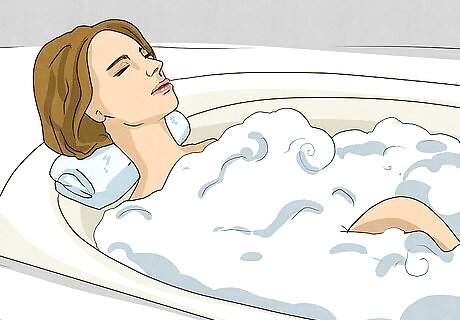 Soak in a bubble bath to relax your whole body. Draw up a warm bath and add some scented soap or bath salts. Play some soothing music and light a few candles, then lean back and enjoy your tub. Taking a bath is a great way to get some alone time (especially if you have kids). You can soak and relax for as long as you need to (or as long as you have time to).