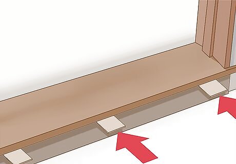 Place shims. Once the threshold is in place and lays tightly on the sub-sill, slide pairs of shims under the center and both ends of the threshold. Do not place shims under the horns. Position the pairs of shims so that the thin end of one shim rests against the fat end of the other shim so that the threshold will lift but won't tilt when you tap on the fat end of the shim.