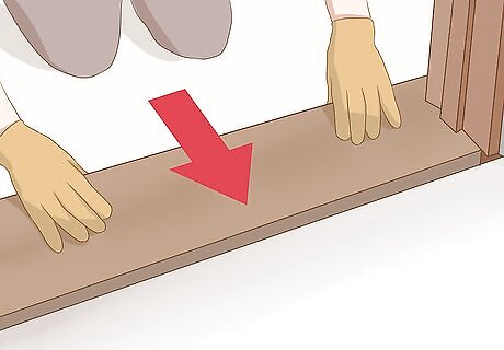 Place the notched threshold in position under the door stops. Use a hammer and a wood block to tap the threshold into place.