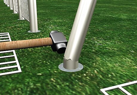 Drive the new post into the ground until the triangular blade at the bottom is below ground. Use a post driver, which is a hollow tube with a weighted end that fits over a metal fence post. It has handles on both sides. You lift the driver and let it fall on the post to drive in the post. They are inexpensive and you can find them at farm stores or hardware stores. Use a sledgehammer if you don’t have a post driver to drive the post in.