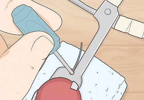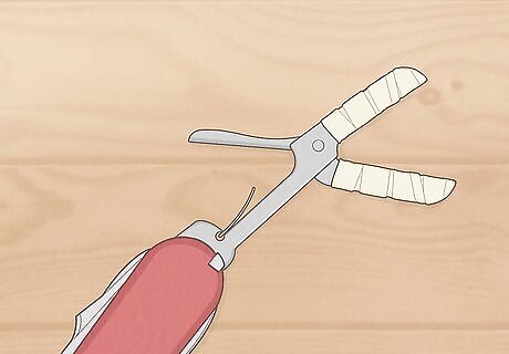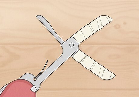 Cover the scissor blades with masking tape to protect yourself from cuts. Open up your knife’s scissors and wrap masking tape 2-3 times around each blade until you cover the sharp blades completely. This will help avoid accidents when you’re swapping out the spring. If you don’t have masking tape, you could use another type of easy-to-remove tape, such as medical tape. Avoid duct tape and electrical tape since they leave a sticky residue on the blades of the scissors. Be very careful not to cut yourself when you’re handling your Swiss Army knife. The tools are all very sharp.