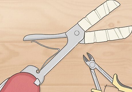 Press the new spring into the hole at the base of the scissors using pliers. Line up the tiny loop on the new spring with the hole in the base of your knife’s scissors. Squeeze the loop into the hole using a pair of needle-nose or other small pliers until it sits flush with the base of the scissors and the spring is in between the handles of the scissors. If the new spring is not sitting flush in the hole, it will be off-center and won’t work as it’s meant to. Make sure you squeeze it all the way into the hole, so your scissors work smoothly.