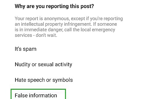 Tap on the 3 dots above the post and select “Report." Whenever you see a post that doesn’t sound believable and has inaccurate information, find the icon that has 3 dots in the corner of the post. Once you click on it, locate and tap the “Report” option from the dropdown menu. You’ll see the icon with 3 dots whether you’re browsing on your phone or your computer. You can also report a fake user by going to their profile and clicking on the same icon at the top of their page. Be wary of spam pages that share cute memes or images even if they don’t directly spread false info. People may still click on their profile and see other posts that do have misinformation.