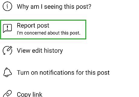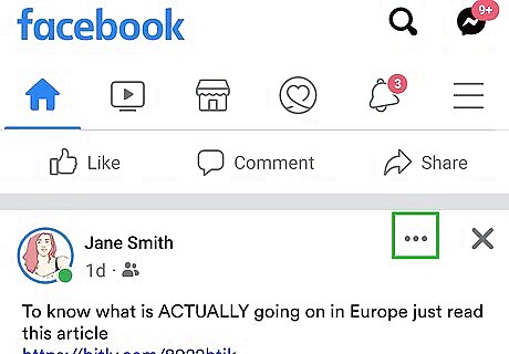 Click on the icon with 3 dots next to the post you want to report. When you see someone share false information or a sketchy article, look near the top corner of the post for an icon with 3 dots. You’ll find the icon no matter what device you’re using. A dropdown menu will appear on the post so you’re able to continue. You can also report a profile or page by clicking the button with the 3 dots underneath their cover image.