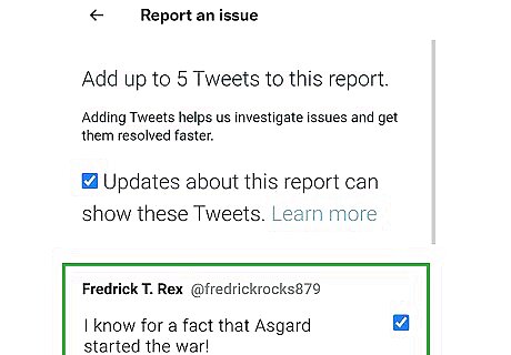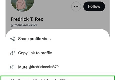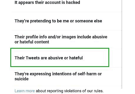 Choose “Report” from the dropdown menu. You’ll see similar options whether you’re reporting a specific tweet, someone’s entire profile, a message, or a list. Locate “Report Tweet” or “Report Profile” from the list and click on it to start your report. The report option may have an icon that looks like a flag.