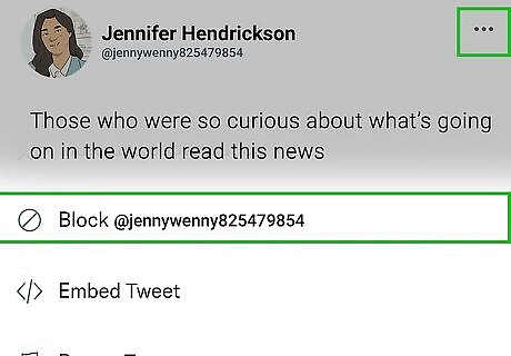 Click on the arrow icon in the top corner of the tweet. When you see someone tweet out a questionable article, look for the downward-pointing arrow in the corner of the post. When you click on it, a dropdown menu will appear with multiple options for interacting with the tweet. This works on the desktop site and the mobile app.