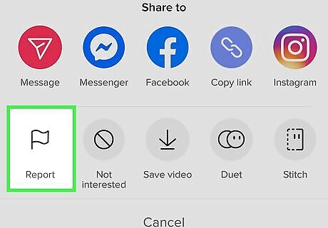 Tap Share followed by “Report” when you see a misleading video. When you open up a video, look at the right side of the screen to find the Share button that has an arrow icon. Tap on the icon to open up a pop-up menu that has ways to interact with the post. Then click on the Report button that has an exclamation point inside of a triangle. You can also tap on the same symbol to report a comment or message.