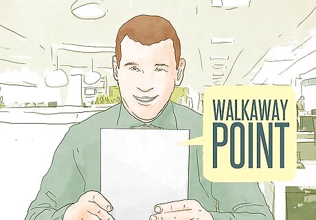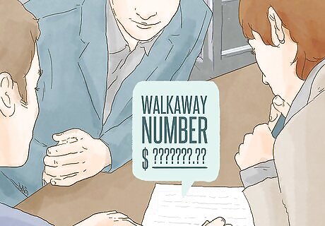 Come up with your “walkaway number.” You need to identify the absolute minimum that you are willing to settle for in negotiations. This is your “walkaway point” or “walkaway number.” By having this number firmly in mind, you can negotiate effectively—and get up from the negotiation table if the other side can’t meet your minimum. The minimum you are willing to settle for is based on a variety of factors. For example, you should consider how relatively strong your case is. Also consider how strong the other side’s evidence is. For example, if you are suing for $100,000 but think you only have a 50% chance of winning, then you might want to settle for $50,000. That could be your “walkaway number.” Talk this over with your lawyer. He or she has more experience and can explain the strength of your evidence. Your evidence might be stronger than you think. If so, your walkaway number could be higher than you would guess.
