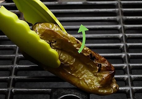 Remove the peppers after 12 to 15 minutes. They will be done when the skins are evenly charred and blistered. If one side is charred and the other isn’t, put it back on the grill for about three more minutes. Make sure to place the uncooked side against the grill. Charred skin looks like dark brown spots or small black areas. If the whole pepper is black, however, you may have burned it.