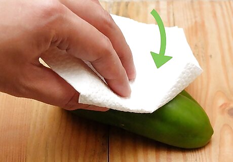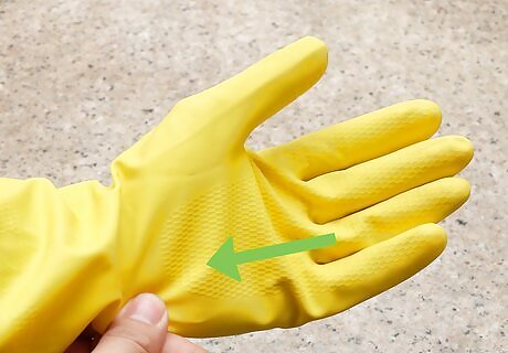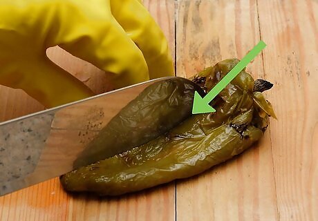 Put on rubber gloves. Peppers can irritate your bare skin and sting your eyes if touched. Before handling the peppers, put on a pair of clean rubber gloves to prevent any mishaps. If you don't have gloves, you will need to wash your hands after handling peppers. Dish soap may be more effective than regular soap at removing irritating pepper oils.