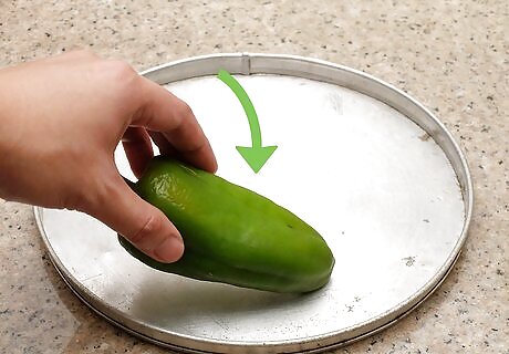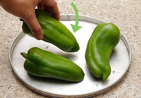 Spread out the peppers on a broiler pan or baking sheet. Rinse the peppers, but do not cut them before placing them on the sheet. The peppers can be close together, but they shouldn’t touch.