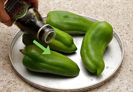 Drizzle olive oil over the peppers. One or two tablespoons of olive oil should be enough. With your fingers, rub the oil into the peppers. They should have an even but light layer of olive oil.