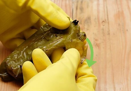 Remove the skins with your fingers. Start peeling where the skins have been charred; these are the dark black marks on the skin. The skin will be looser here and easier to pull away. Work your way around the entire pepper until you have removed most of the skin. The skins of a poblano pepper tend to be very bitter. You may not want to leave any skin on the pepper. The skins should feel crinkly while the edible flesh will be soft.
