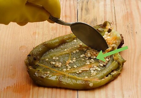 Scrape out the seeds with a spoon. Try not to scrape up too much of the flesh. Just gently brush off the seeds until they are all gone. At this point, you may slice or prepare the peppers according to your recipe.