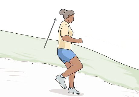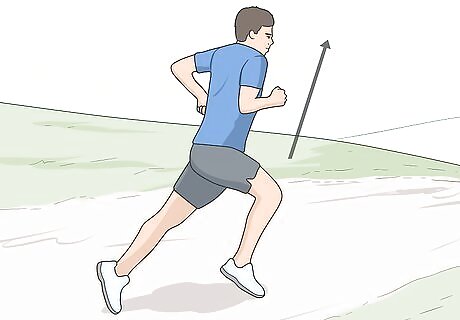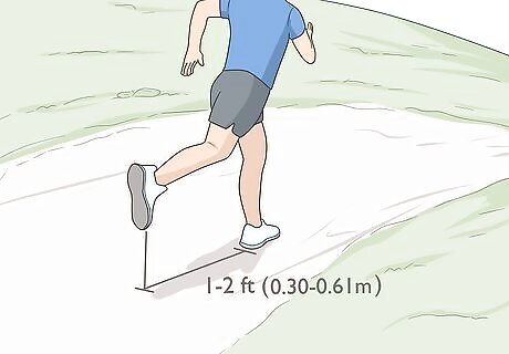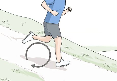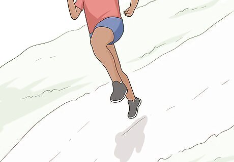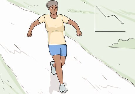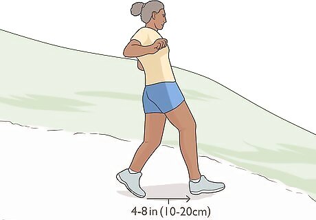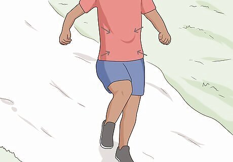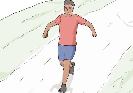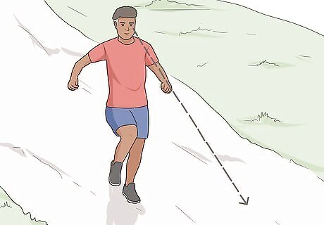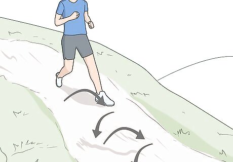 Take shorter strides while running on steep inclines. If you normally lead your legs 3–4 feet (0.91–1.22 m) in front of you when you run, shorten your stride to only bring your legs 1–2 feet (0.30–0.61 m) in front of you. Using shorter strides will not only decrease your pace, but it will also keep the additional pressure off of your knees as your land with each step. When you run downhill, the impact on your knees is increased as you compensate to land on the uneven surface. Taking shorter strides will keep your joints safe while you run.
