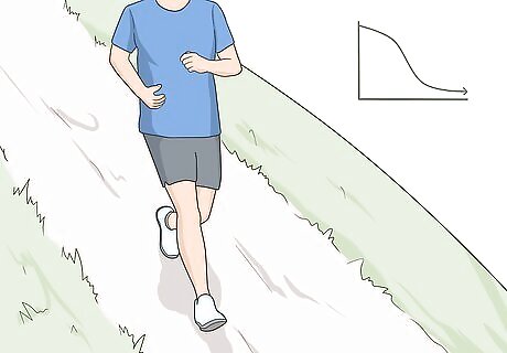Start with easy slopes before working your way up to steeper hills. Running downhill is difficult and requires a good form. To get practice, start out with an easy hill first. Once you’ve mastered an easier hill and become used to compensating for the gravity on a slope, you can start ramping up the difficulty with a steeper decline.Warning: Do not go running on a steep decline if you aren’t positive that you can keep your balance. If the decline is steeper than 25 degrees, you may struggle to maintain balance while running. Never run on a decline in the rain or snow, since you’re more likely to slip and fall.