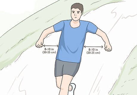 Leave your arms at your sides and use them to balance. Instead of swinging your arms in front of you and behind you as you normally do, keep your elbows at your side. Raise your arms 8–10 in (20–25 cm) away from your body, sort of like wings, to balance yourself as you run downhill. Bring your arms forward or behind you as needed to stabilize your center of gravity as you run. Since you can’t lean forward or backwards as you normally would, rely on your arms to help you balance.