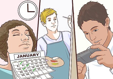 Do a relaxing activity once a week. To help relieve any stress or tension you might be feeling in college, try to fit in one relaxing activity a week. Self-care is a big part of maintaining good mental health. Treat yourself to a bath or an hour of time to yourself where you take a nap, paint, or doing another relaxing activity. Focus on a hobby you enjoy, such as reading, writing, or playing video games. Schedule in time in your week for relaxation, as this will prevent you from feeling overwhelmed. You may also find spending times with friends or going for walks on your own can be relaxing and calming. Even simple activities can help you let go of stress and get your mind off school, if only for a short period of time.