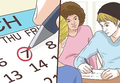 Stay organized and prepared for class. To help avoid high levels of stress and anxiety, try to stay organized and prepared while in college. Make a calendar of due dates and deadlines for your classes. Join a study group to help you prepare for class. Do readings and assignments for class ahead of time so you are not cramming to get them done. It may help to stick to a schedule where you study at a certain time and then allow yourself some free time between studying. You can also work on assignments a little at a time so you do not end up cramming or get stuck doing them all at once.