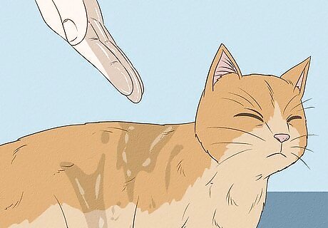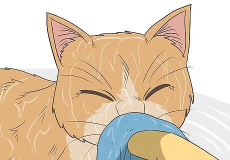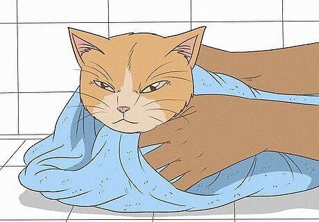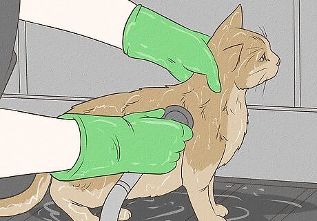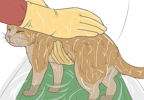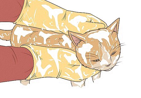 - When bathing a cat, massage cat shampoo into their coat from the neck down. Use a washcloth for their face and head.