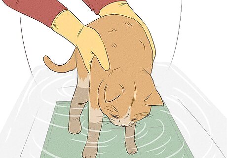 Desensitize your cat to water. If your cat isn’t used to being wet, don’t jump right into giving it a bath. Instead, slowly allow them to get comfortable with water over the course of days or weeks. Try dribbling water over their body or using a damp cloth on their legs. If your cat seems uncomfortable, stop and try again later so you don’t stress them out. If your cat has never been in the bathroom before, get them used to the area by allowing them to explore. Try letting the water run in the tub or sink so they get used to the sound.
