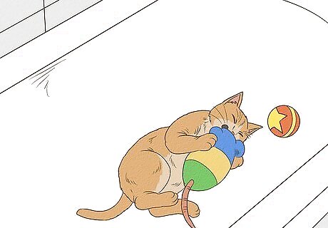 Tire your cat out before bathing. Play with your cat so they’re at their most mellow before they enter the water. This will help stop them from biting and scratching or trying to get away. Choose a time when they’re already calm, like after you feed them. Here are some other ways to get your kitty adjusted to the bath: Put some cat toys in the empty tub and allow your cat to play for a few minutes. Then, stop and add a little water before playing again. This allows your cat to get used to the tub and the water and helps them associate bath time with something pleasant and non-threatening. Pick out a special toy just for bath time, like a mouse on a string or something that floats. Only allow your cat to play with this toy in the tub to encourage them to look forward to bathing instead of fearing it.