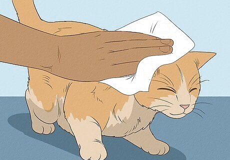 Wash your kitty’s face with damp washcloth. There’s no need to take the risk of upsetting and hurting your cat by getting shampoo or soap in their eyes. Take a wet washcloth and gently run it along their face, brushing the fur away from their eyes and nose, until their head, face, and ears are nice and clean. You can also use a grooming wipe to clean their face and an ear cleaner for their ears. Just be sure to follow all directions carefully. If the bath was unsuccessful or particularly stressful to your cat, consider leaving this step for another time. Never force a cat’s face underwater. This is guaranteed to make them panic.