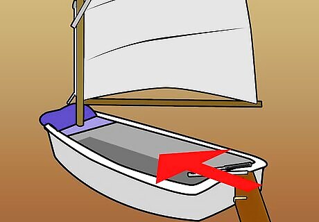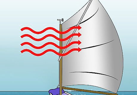 Make sure the sail is always trimmed (adjusted) so that it will catch the wind. Never sail directly into the wind. Pulling the tiller towards you will point the boat further away from the wind and pushing it away will point the boat more towards the wind if you are sitting on the opposite side to the sail. When going upwind, pull in the sail so that the end of the boom is at the back corner of the boat. When going downwind, let out the sail so that it is perpendicular to the rail. Always watch the sail and the wind direction so that you will be forewarned if the sail wants to come across the boat towards you. If the boom hits you, it will hurt!! Keep in mind that a boat cannot sail directly into the wind.