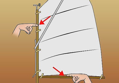 Assemble the sail. The sail ties should only be loose enough so that you can put a finger between them and the boom (also ensure that the sail can move over the boom without being caught on fittings). The mast ties should be tighter than this (so that the edge of the sail is up against the mast). Put the sail in the mast step (the metal fitting at the front of the boat) before putting up the spirit pole. The adjustments on the sail should be tightened/loosened so that no creases are visible. Generally, heavier wind requires tighter adjustments.